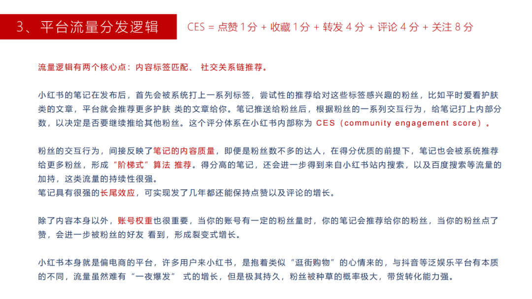 推荐机制:笔记发布后先打标签推荐给粉丝→根据CES评分决定是否扩大推荐→长尾流量持续加持